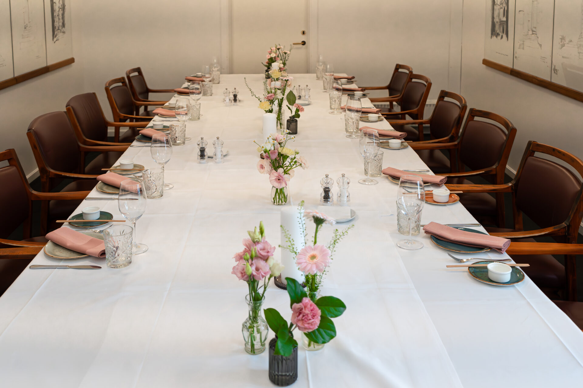 i eget opdækket lokale m. hvide duge og simpel blomsterpynt.